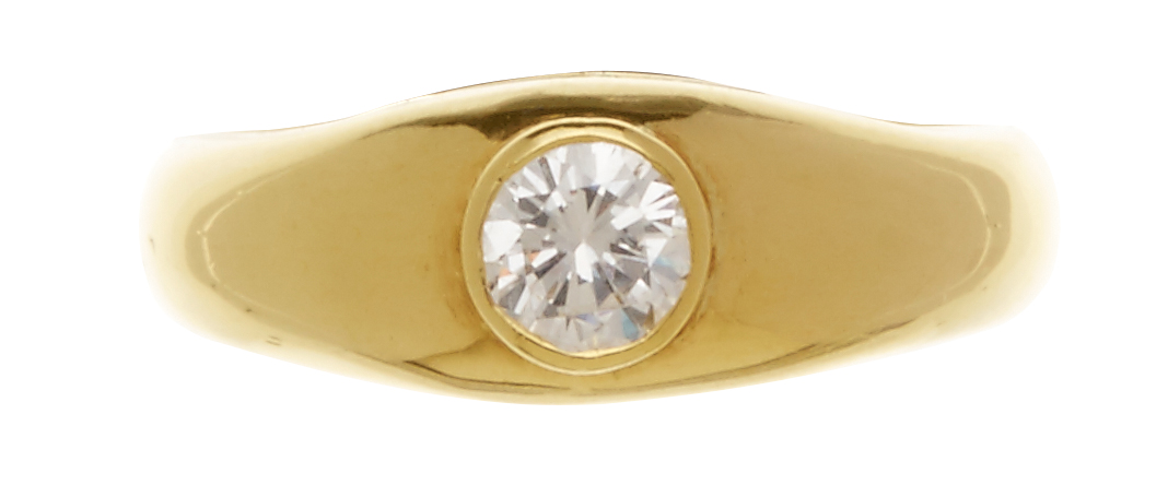 The bezel set round brilliant cut diamond, estimated weight 0.36cts, in 18ct gold, ring size M.