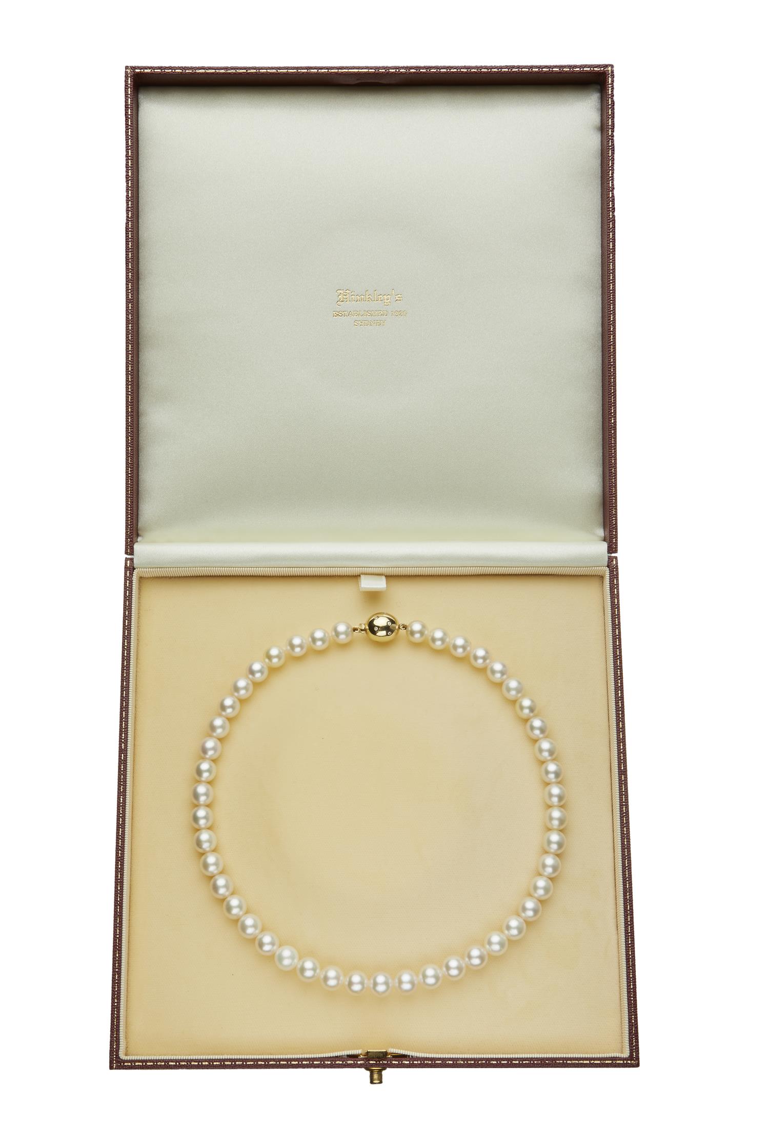 The round pearls of silver white hues, measuring 9.0mm to 9.5mm, to a diamond set clasp, in 18ct gold, total length 430mm.