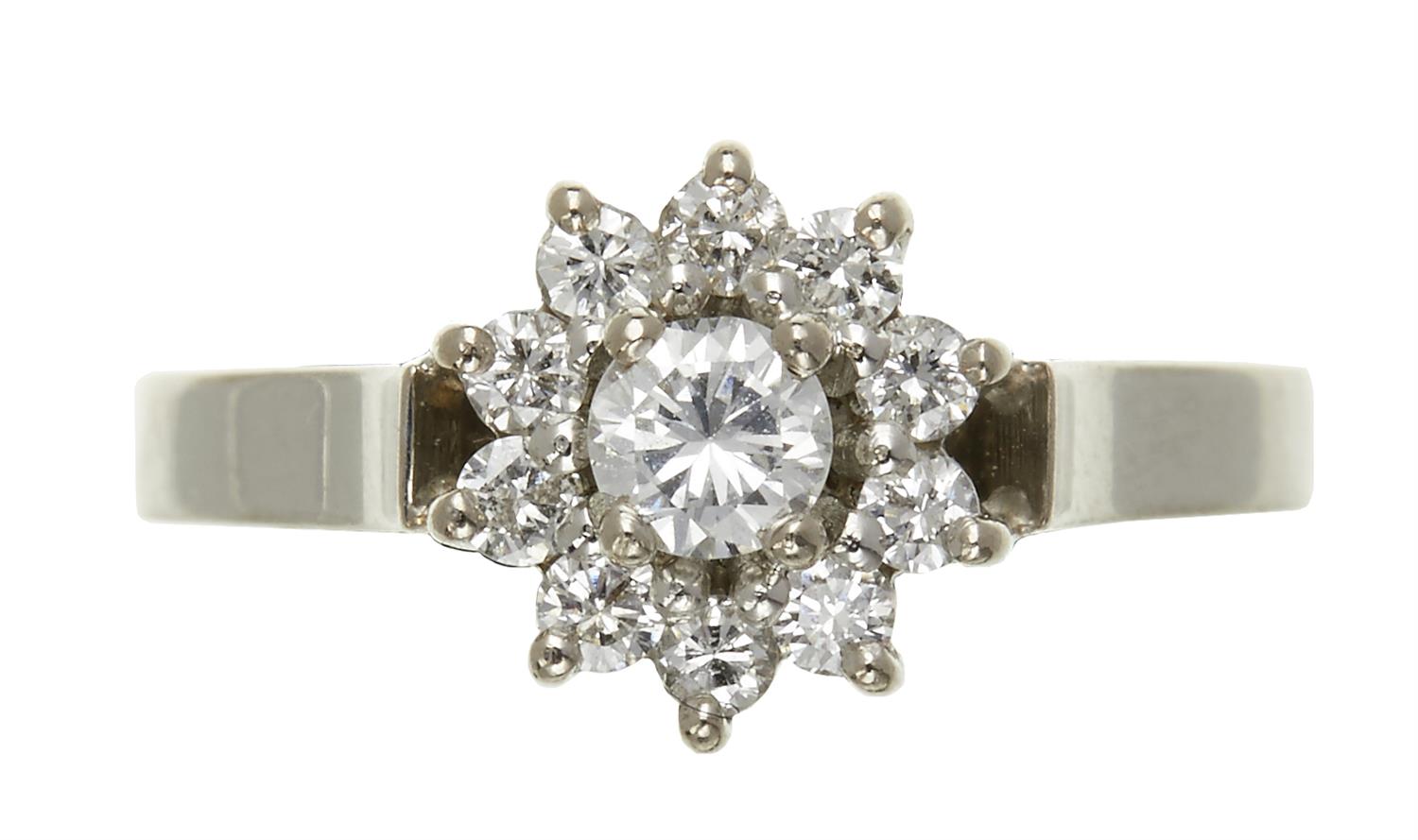 The central brilliant cut diamond, estimated weight 0.23cts within a surround of ten brilliant cut diamonds, estimated total weight 0.31cts, in 18ct white gold, ring size N.
