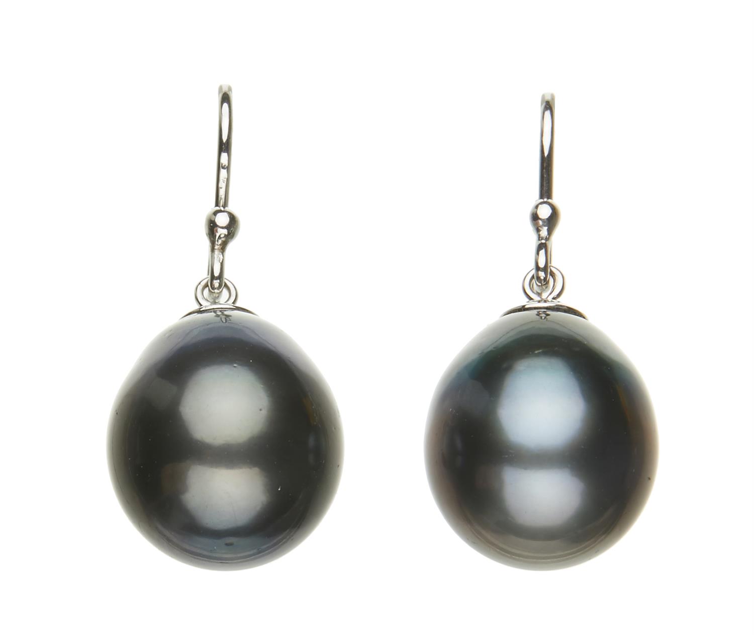 The drop shaped pearls of silver and grey hues, measuring 15.0mm by 13.0mm, to shepherd hook fittings, in white gold, 18cts.