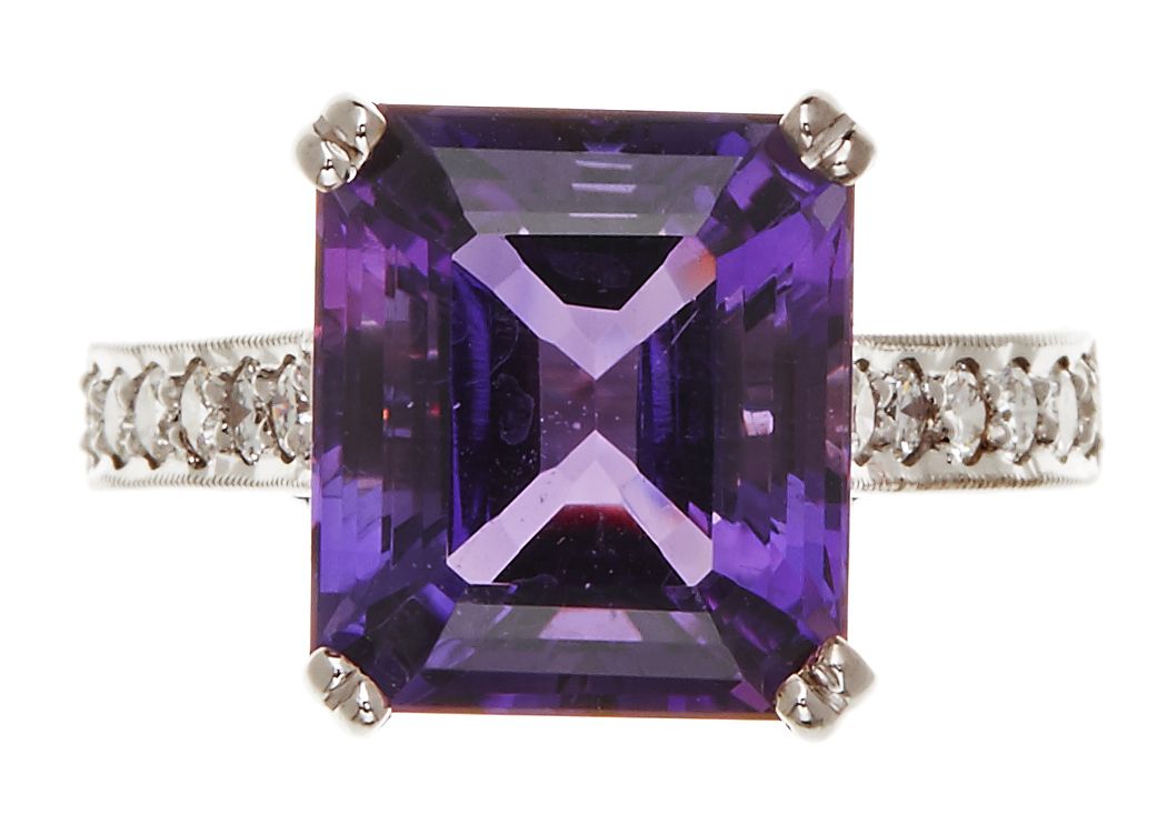 The central rectangular cut amethyst, estimated weight 6.51cts, set with twelve brilliant cut shoulder diamonds, estimated total diamond weight 0.38cts, in 18ct white gold, ring size N 1/2.