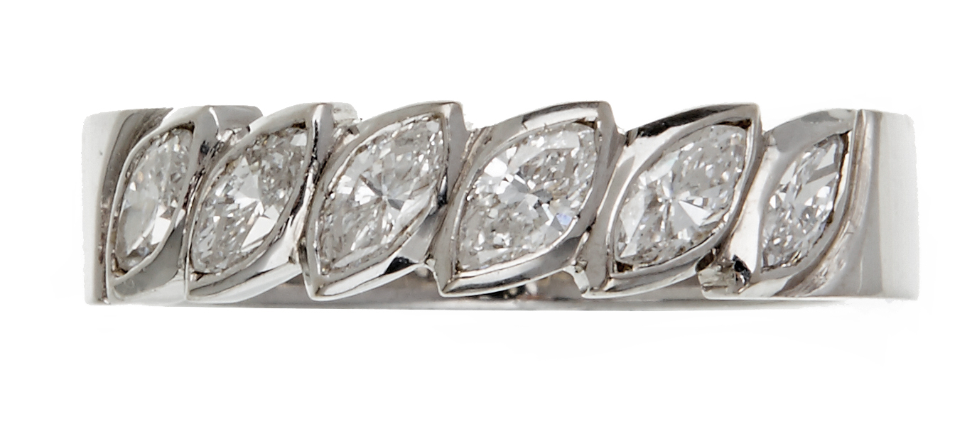 Comprising six marquise cut diamonds, bezel set in a row, estimated total diamond weight 0.90cts, colour G-H, in 18ct white gold, ring size N.