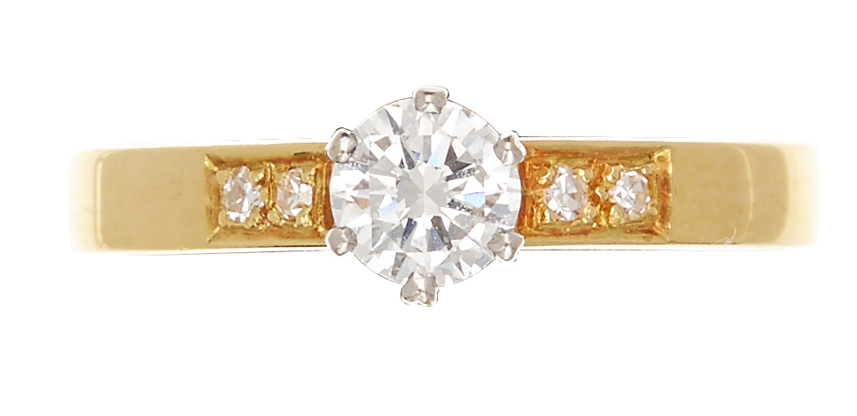 The central brilliant cut diamond, estimated weight 0.33cts, colour H, clarity VVS2, shouldered by four single cut diamonds totalling 0.04cts, in 18ct gold, ring size K 1/2.