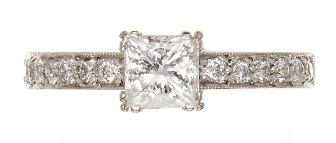 The central square cut diamond, estimated weight 0.90cts, colour F, clarity SI, shoulder set with twelve brilliant diamonds, estimated total weight 0.26cts, colour F, clarity VS, in 18ct white gold, ring size O.