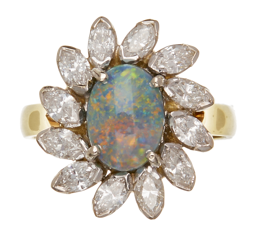 The oval black lightning ridge pin-fire opal cut en cabochon, estimated weight 1.35cts, within a surround of twelve marquise cut diamonds, estimated total diamond weight 1.17cts, in 18ct yellow and white gold, ring size M 1/2.