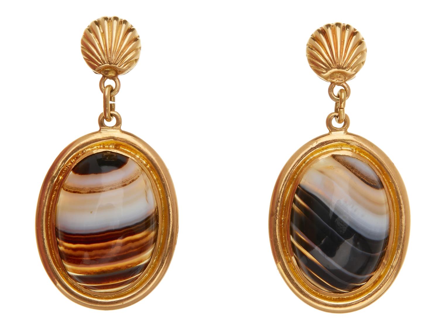 Each earring compruising a shell shaped stud, supporting an oval banded agate cut en cabochon, to post and butterfly fittings, in 14ct gold.