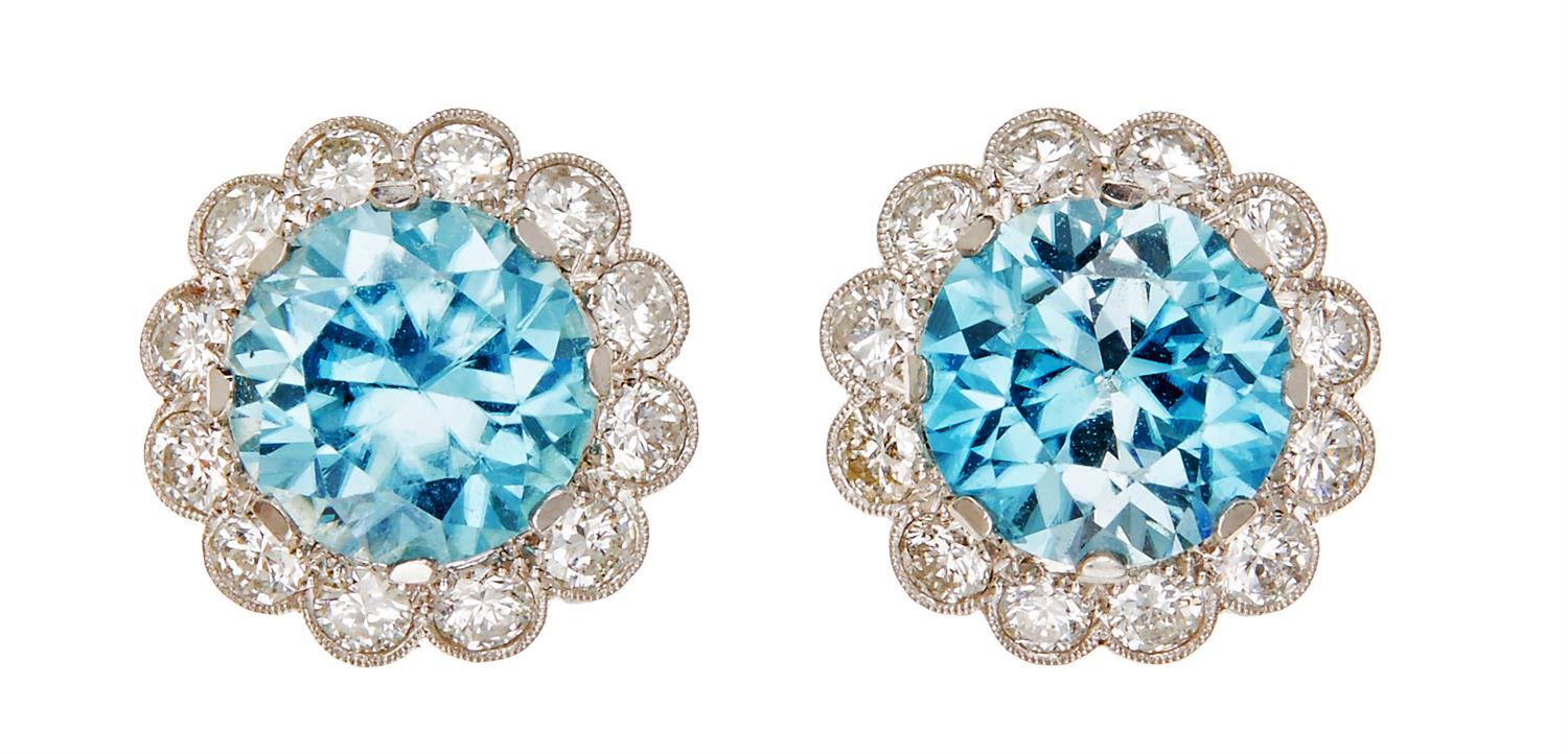Each earring set with a round cut blue zircon, within a surround of twelve brilliant cut diamonds, estimated total diamond weight 1.0ct, to screw back fittings, in 9ct white gold and platinum.