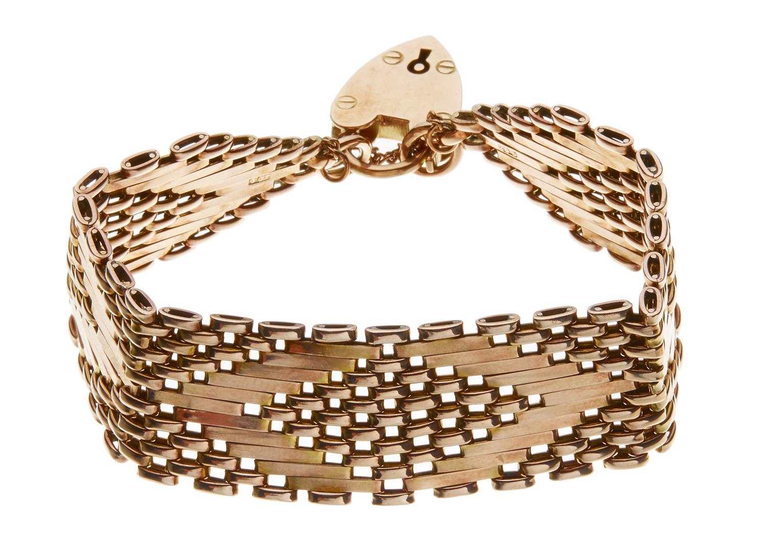 The traditional gate link design with heart shaped padlock and safety chain, in 9ct gold, total length 190mm.