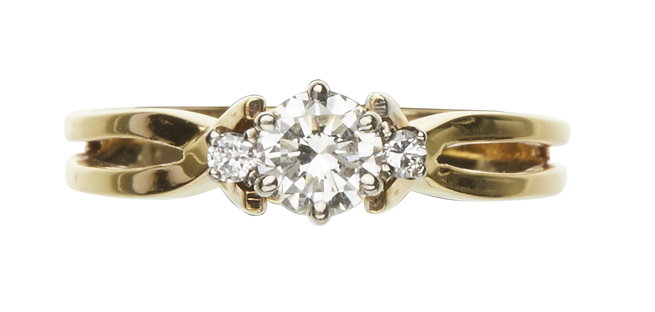 The central brilliant cut diamond, estimated weight, 0.38cts, set with two shoulder diamonds, estimated weight 0.05cts, in 18ct yellow and white gold, ring size N.