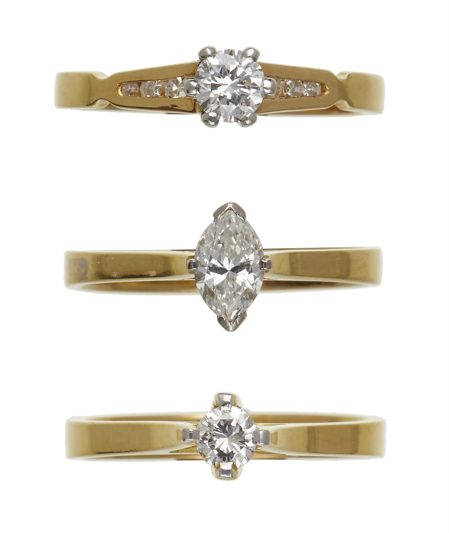 Diamond approximate sizes 1 x marquise cut 0.41cts, 1 x Round Brilliant cut 0.25cts, 1 x Round brilliant cut 0.15cts. Approximate colour G-H & Clarity SI1-SI2. Rings (x3) approximate weight 7.5gms.