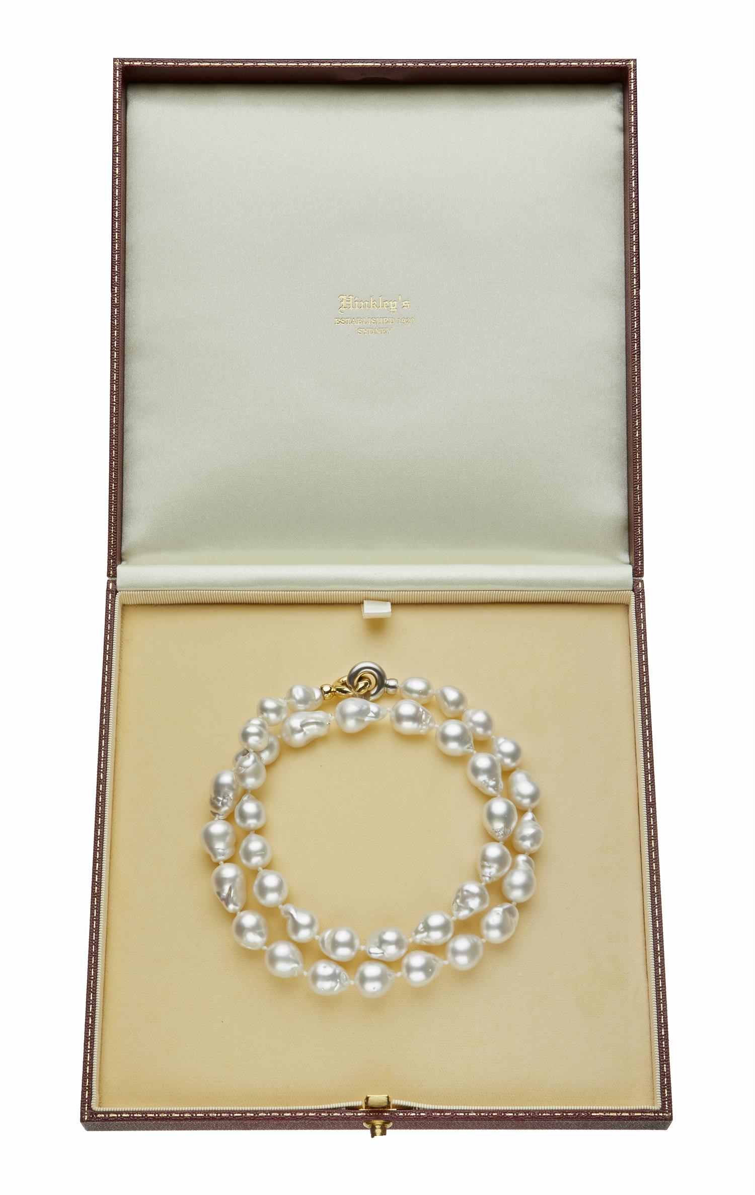 The baroque shaped pearls of white/silver hues, graduating in size from 11.0 to 12.4mm, to a clasp in 18ct yellow and white gold, total length 630mm.