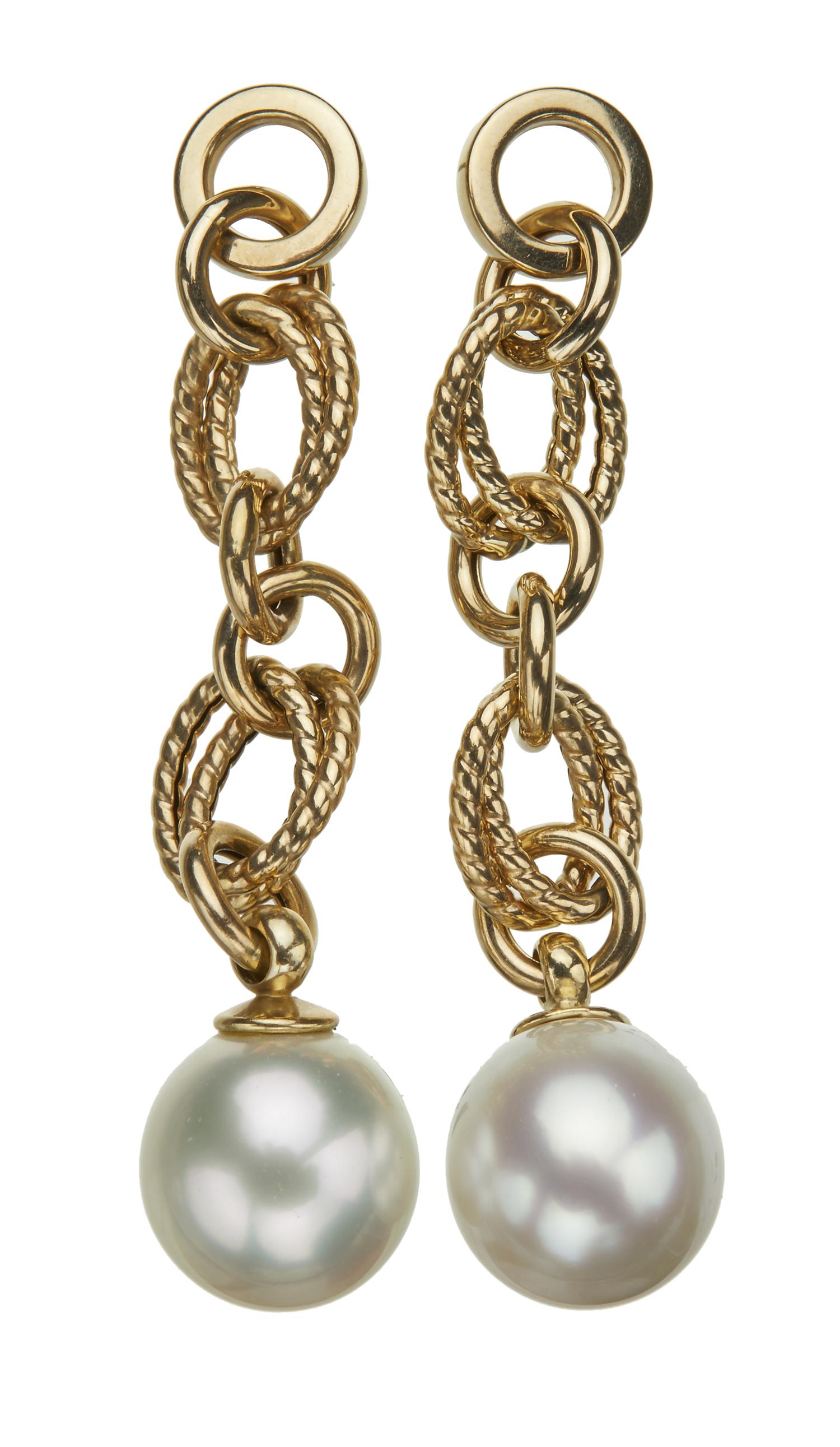The gold fancy link mounts, each suspending a round pearl measuring 11.0mm, in 18ct gold.