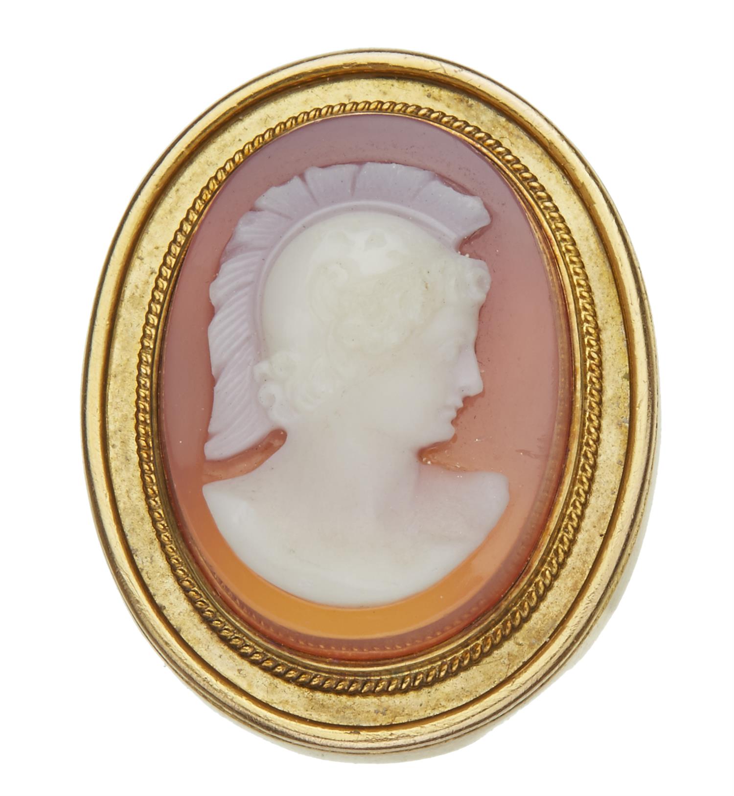 The oval hardstone cameo depicting the profile of a Roman soldier, in 15ct gold.
