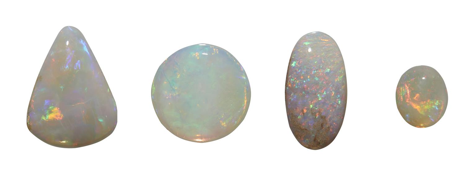 Solid white opals in various shapes. Weights: 1.17cts, 0.76cts, 2.44cts, 3.37cts