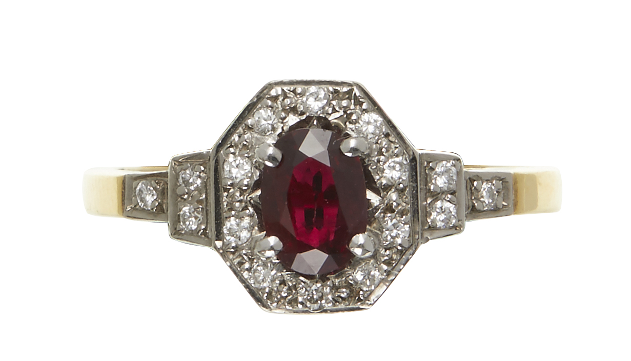The central oval ruby, estimated weight 0.30cts, surrounded by ten brilliant cut diamonds and six shoulder diamonds, estimated total diamond weight 0.92cts, in 18ct yellow and white gold, ring size O.