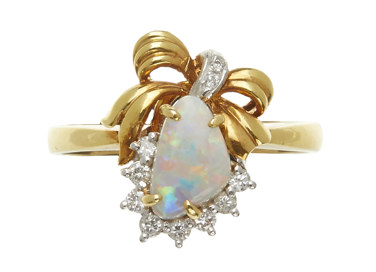 The triangular shaped opal set with eight brilliant cut diamonds and two single cut diamonds, in 18ct gold, ring size N.