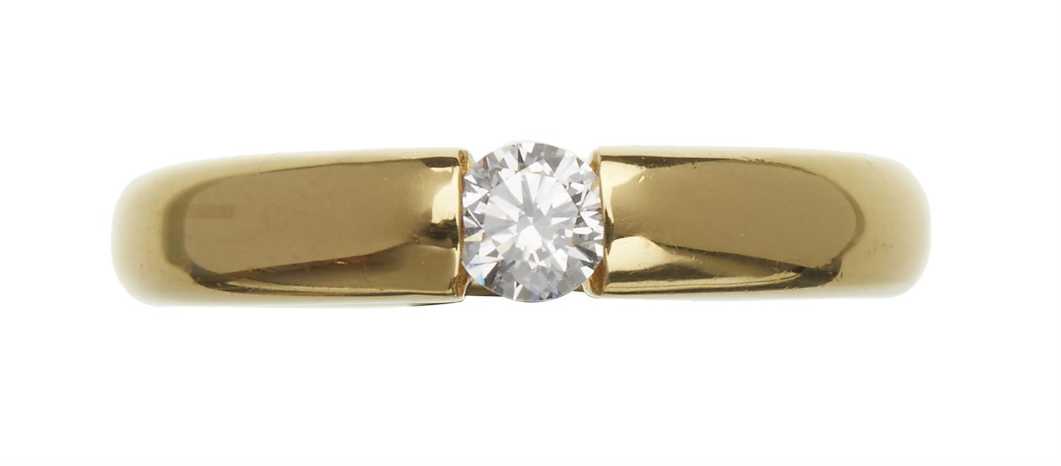 Centrally set with a brilliant cut diamond weighing 0.30cts, in 18ct gold, ring size O.