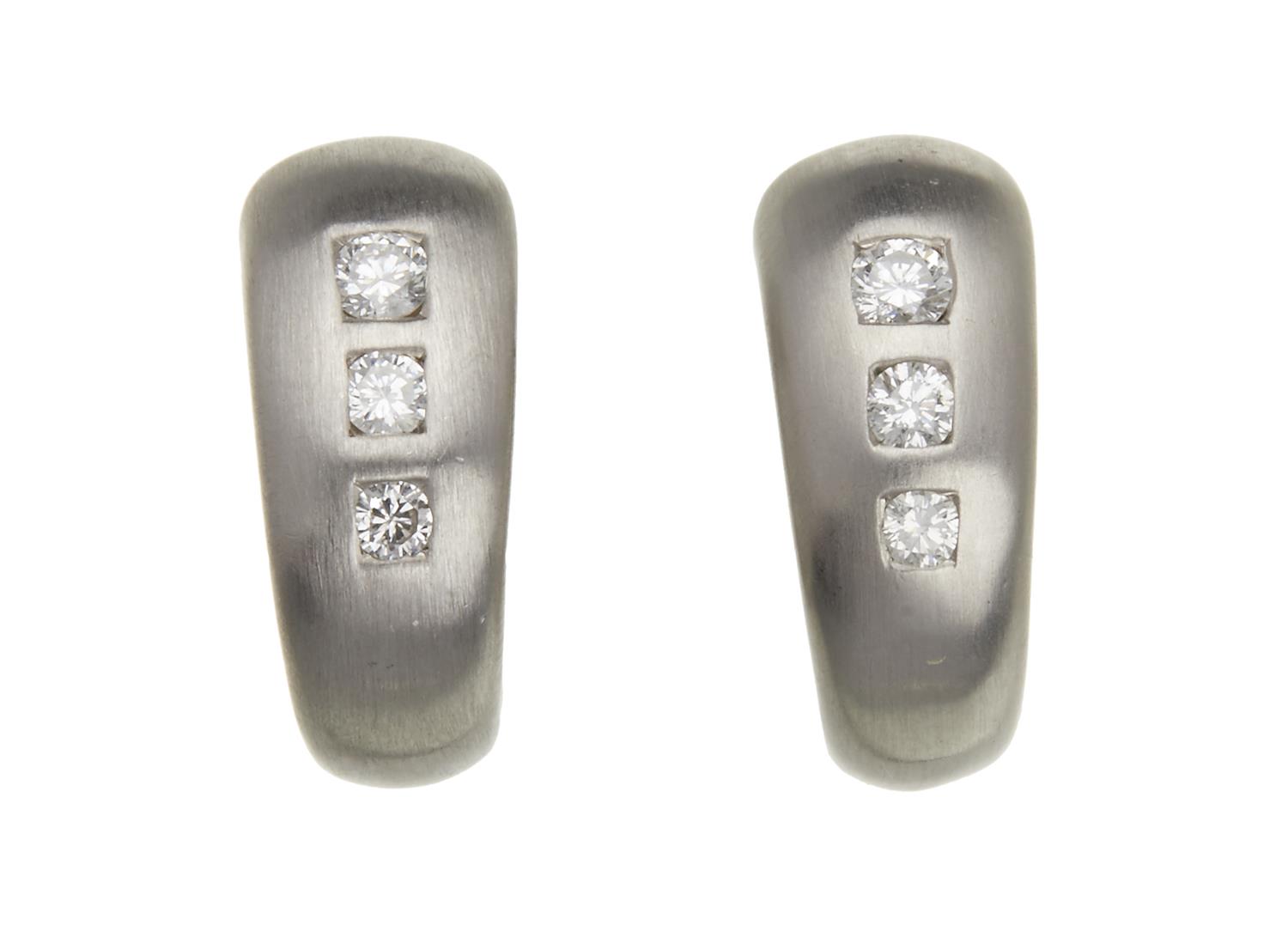 Each earring set with three brilliant cut diamonds, total estimated diamond weight 0.26cts, in brushed white gold.