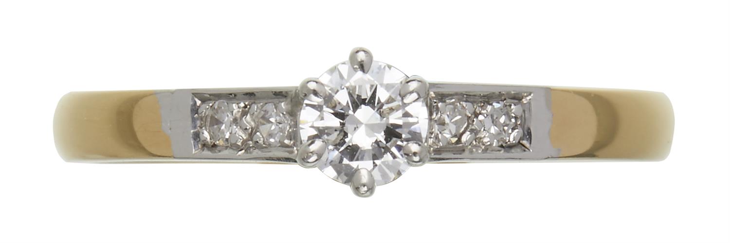 Centrally set with a brilliant cut diamond weighing 0.21cts and shoulder set diamonds, estimated weight 0.04cts, in 18ct yellow and white gold, ring size N.