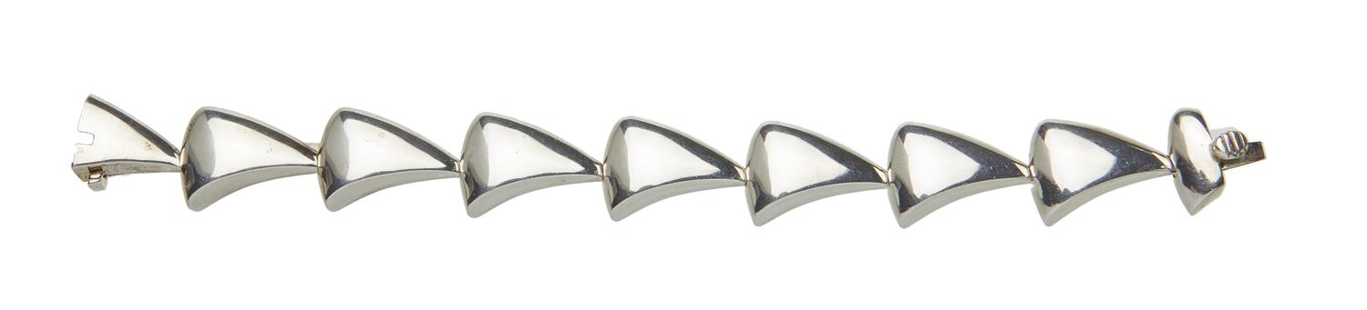 Comprising polished triangular links to a clip clasp, in silver, total length 180mm.