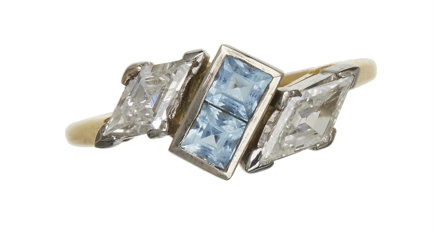 Centrally set with two princess cut aquamarines, estimated weight 0.33cts, shouldered by two fancy cut diamonds, estimated weight 0.46cts, in 18ct gold, ring size L.