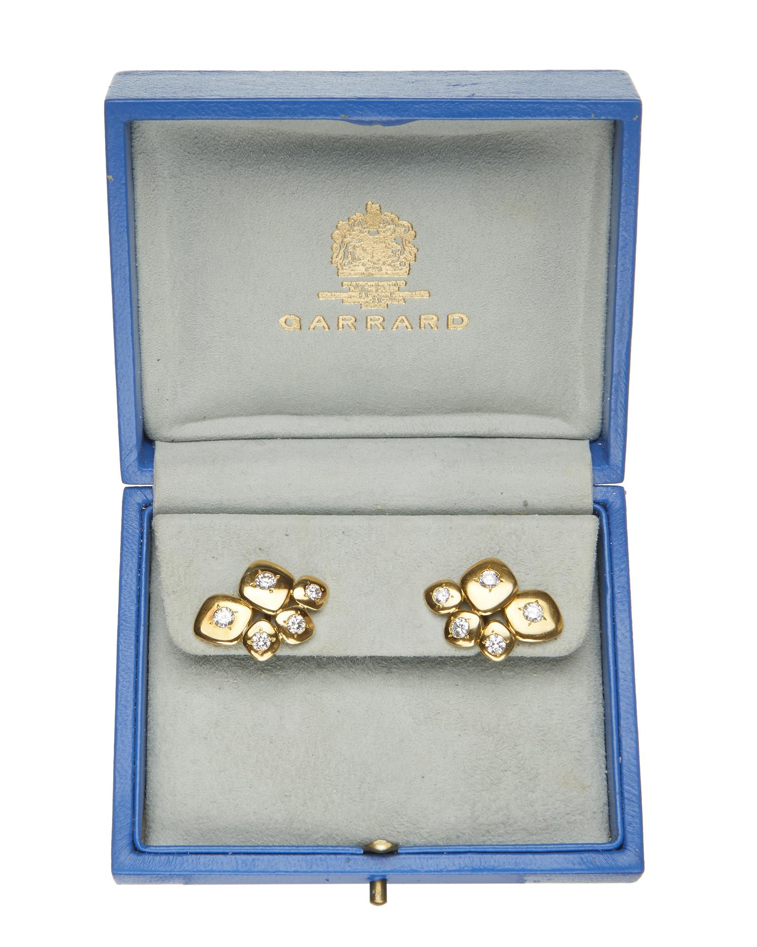 Each earring featuring a free form design set with five brilliant cut diamonds, estimated total diamond weight 1.10cts, in 18ct gold, signed Garrard, with original box.