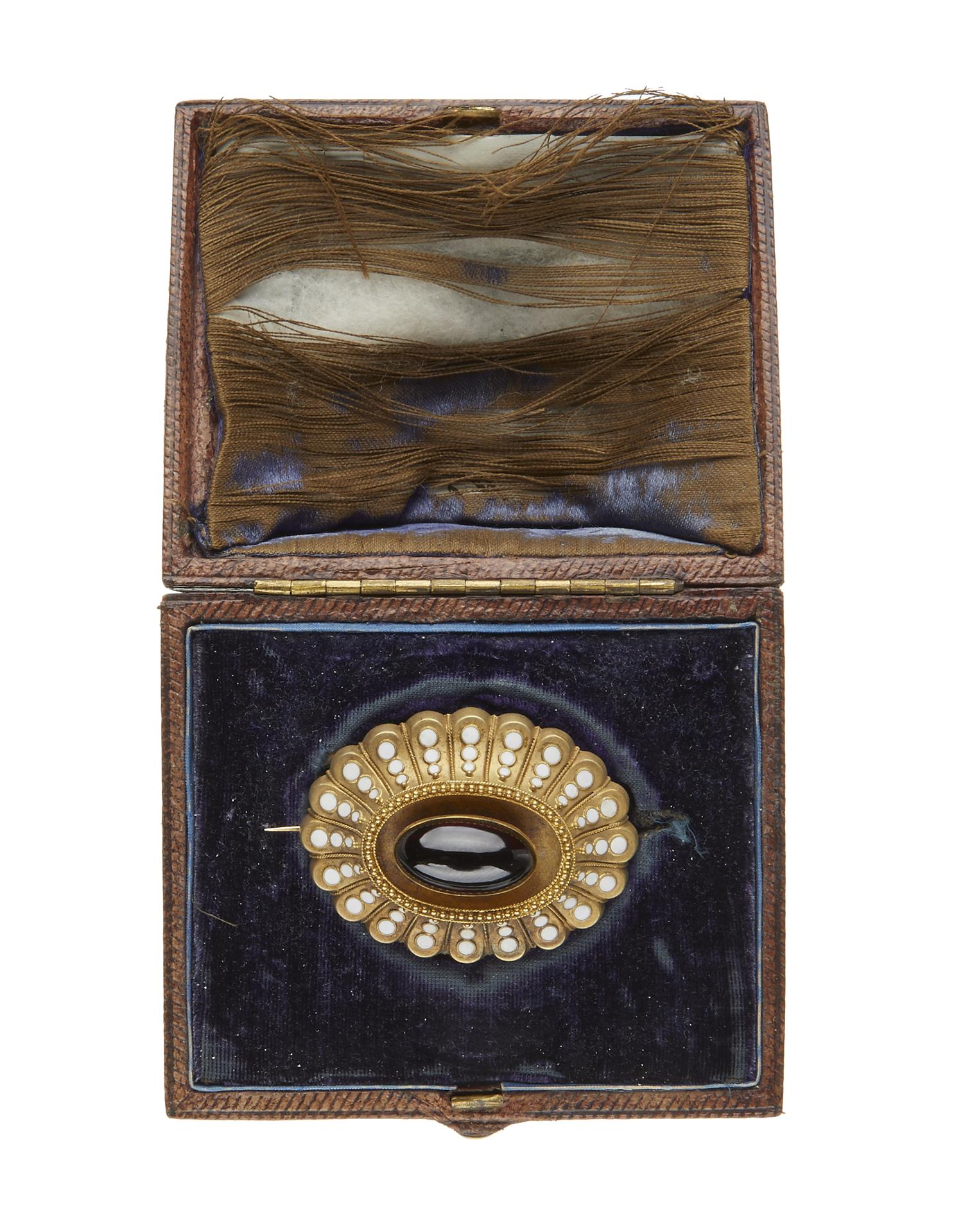 Of shell design, set with an oval garnet cut en cabochon and white enamel decoration, in 15ct gold.