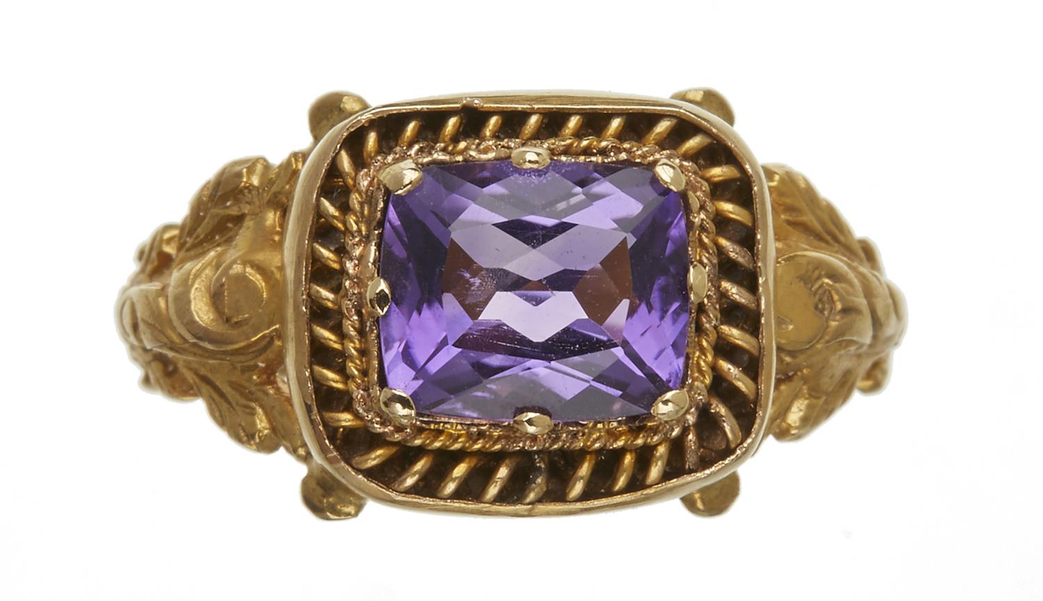 Set with a cushion cut amethyst weighing 2.0cts, in 18ct gold, ring size P.