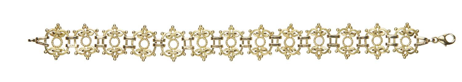 Of scroll decoration, in 18ct gold, total length 190mm.
