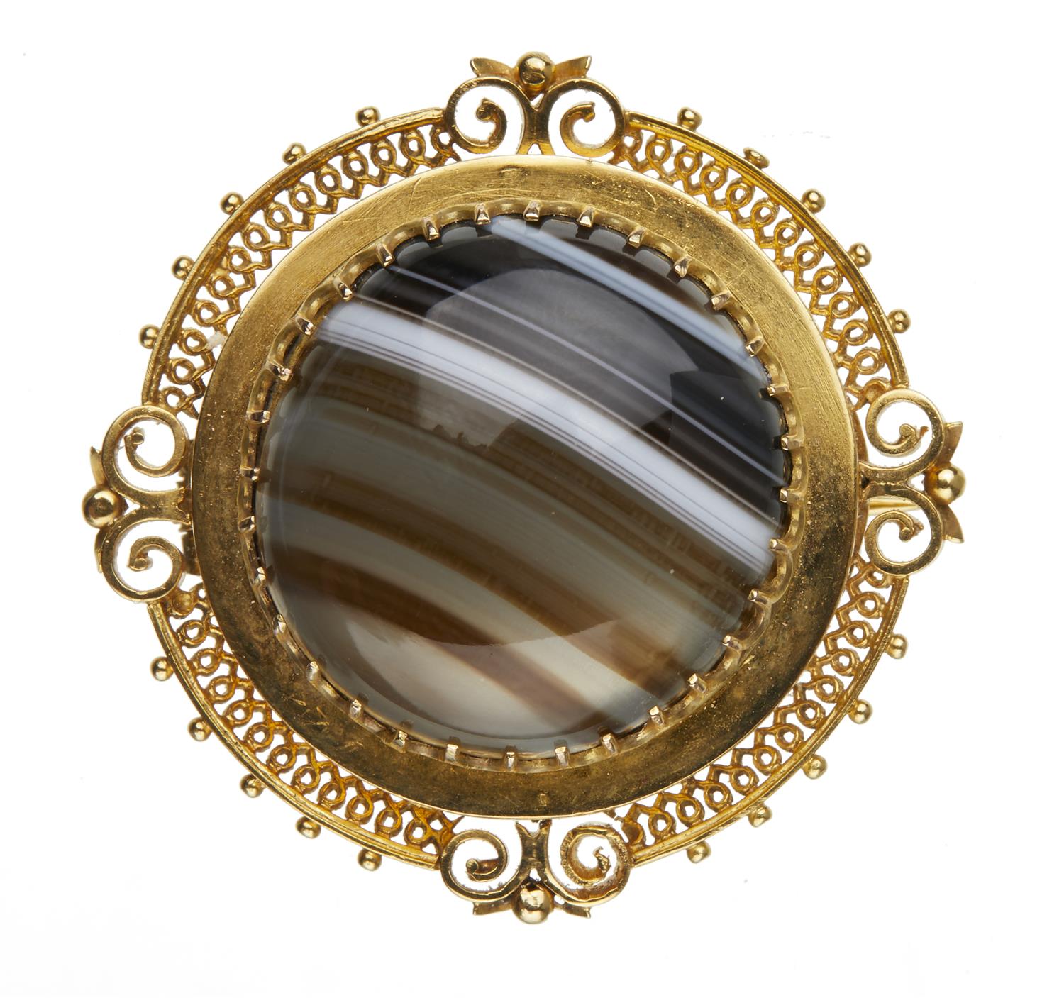 The domed circular banded agate in a multi claw setting within a decorative filigree surround, in 15ct gold.
