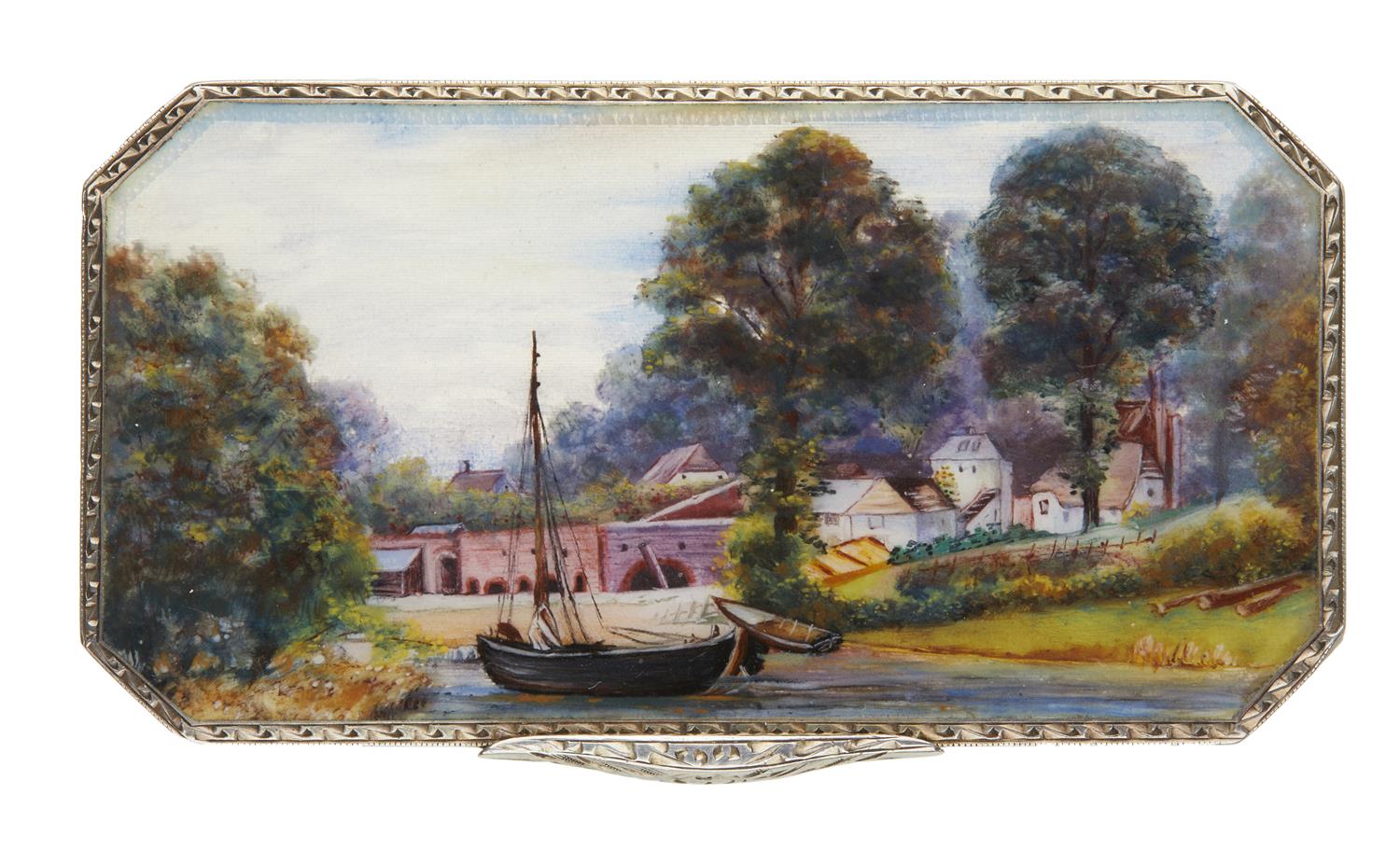 The hinged lid decorated with an enameled landscape, import marks for H.C. Freeman, Birmingham 1913.