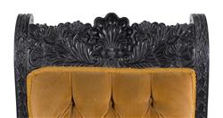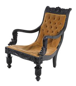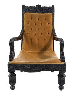 The seat has collapsed and the upholstery stained and faded in places, the uooer right hand corner of the upholstered back is fractured, the back right hand leg has a loss to the base, there are repairs to the joins between both arms and stiles, losses to the lacquer throughout. There is a fracture to the left hand legs and repairs to the right hand leg
