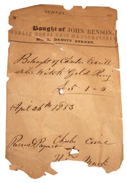 Including a purchase reciept from John Benson, Curled Horse Hair Manufacturer, 1 Druitt Street, April 26th 1853.