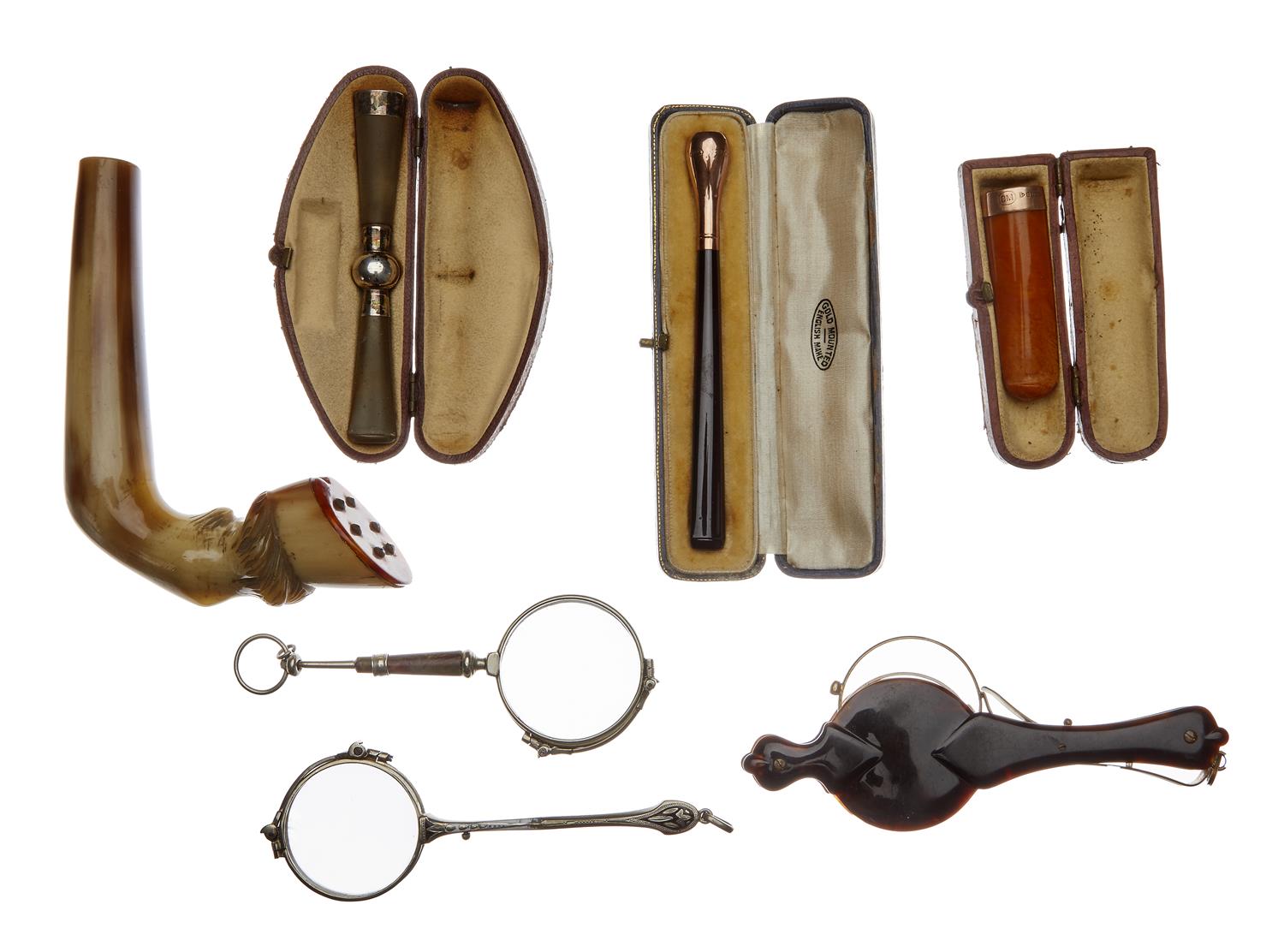 A CARVED HORN WALKING STICK HANDLE, TWO CIGARETTE HOLDERS AND ONE CIGAR HOLDER WITH THREE LORGNETTES