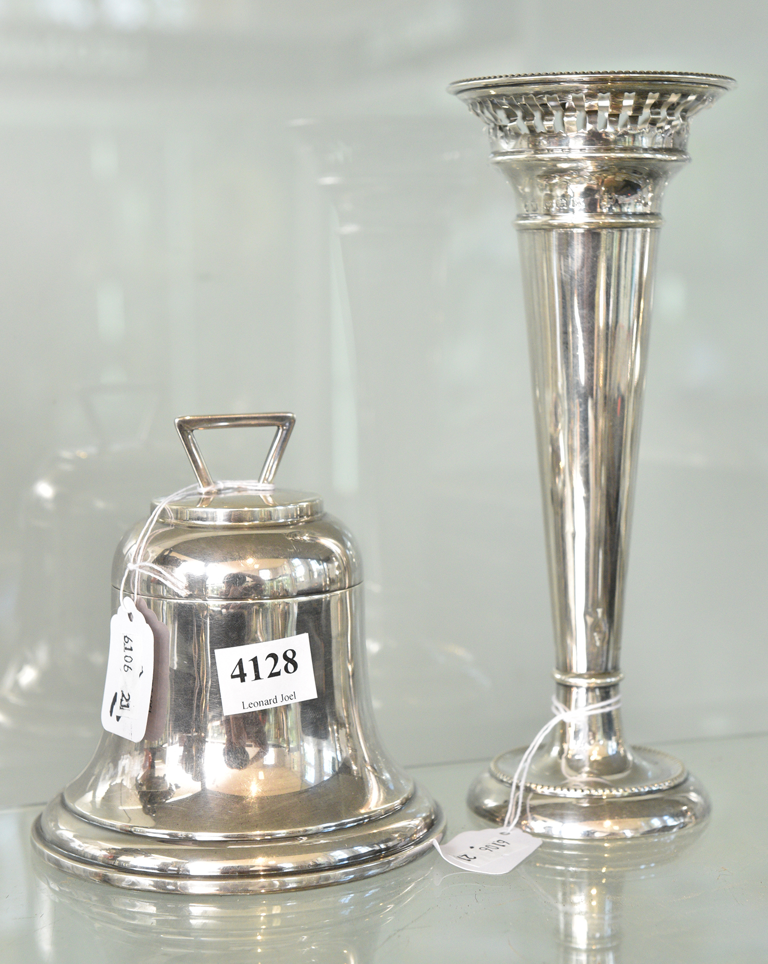 A STERLING SILVER TRUMPET VASE AND BELL SHAPED INK WELL