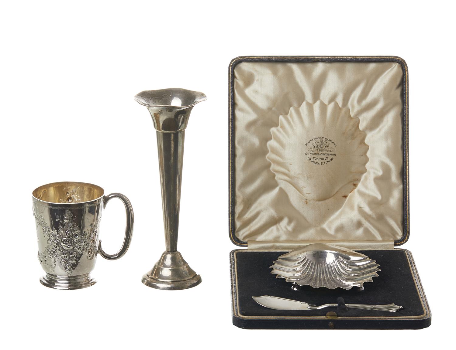 The christening mug hallmarked Sheffield 1880, the flower vase bearing 'Sterling Silver'