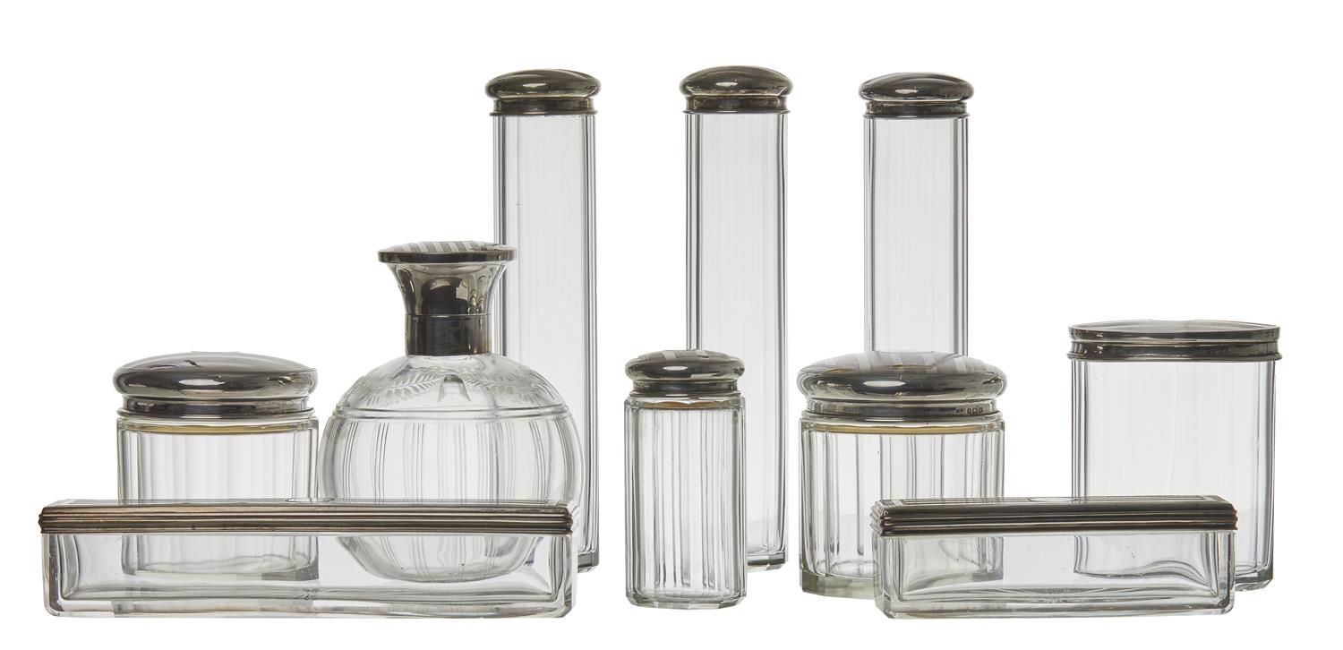 NINE STERLING SILVER TOPPED DRESSING TABLE BOTTLES, AND A SCENT BOTTLE