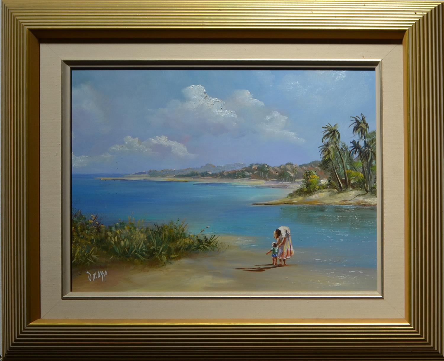 DA LOZZO, FIRST STEPS, OIL ON BOARD, IMAGE SIZE: 29 X 39CM, CONDITION: GOOD CONDITION, MINOR BROWN SPOTS LEFT HAND SIDE, FRAMING IN GOOD CONDITION, FRAME SIZE: 48 X 58CM