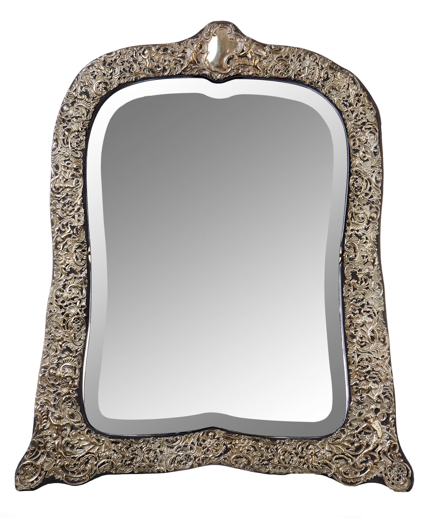 AN EXCEPTIONAL STERLING SILVER BEVELLED TABLE MIRROR
