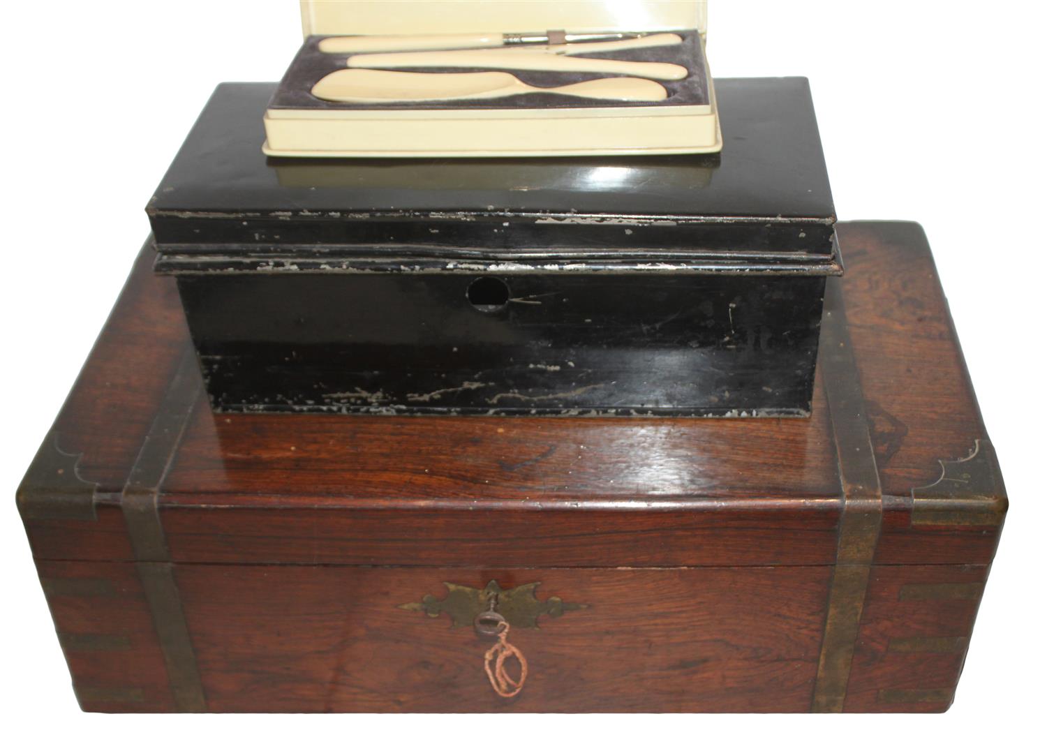 A WRITING BOX, CASH BOX AND A MANICURE SET