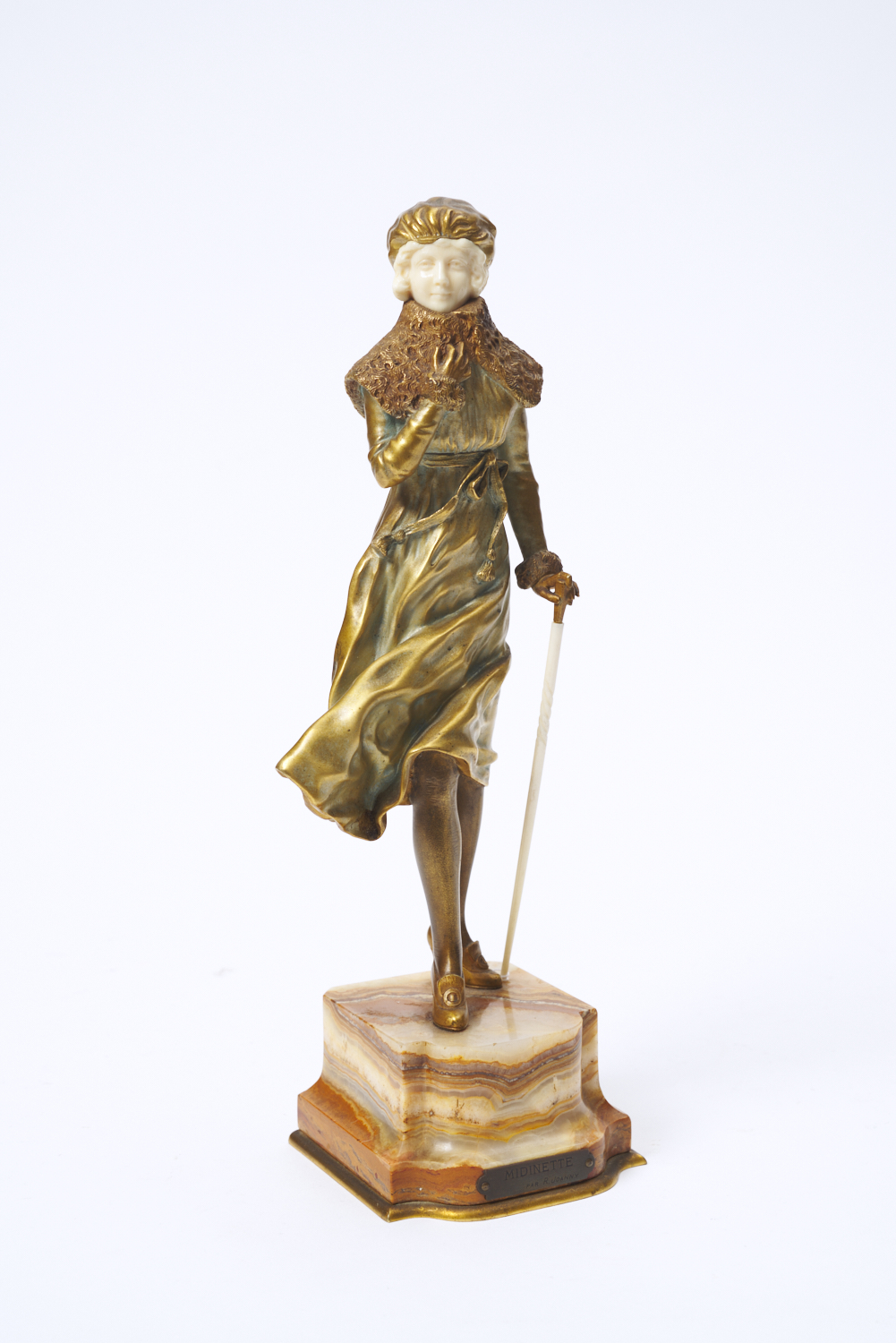 The onyx base bearing a plaque 'Midinette, par R. Joanny'. The underside of onyx base stamped 'Fabrication Francaise, Paris- G.M'.
