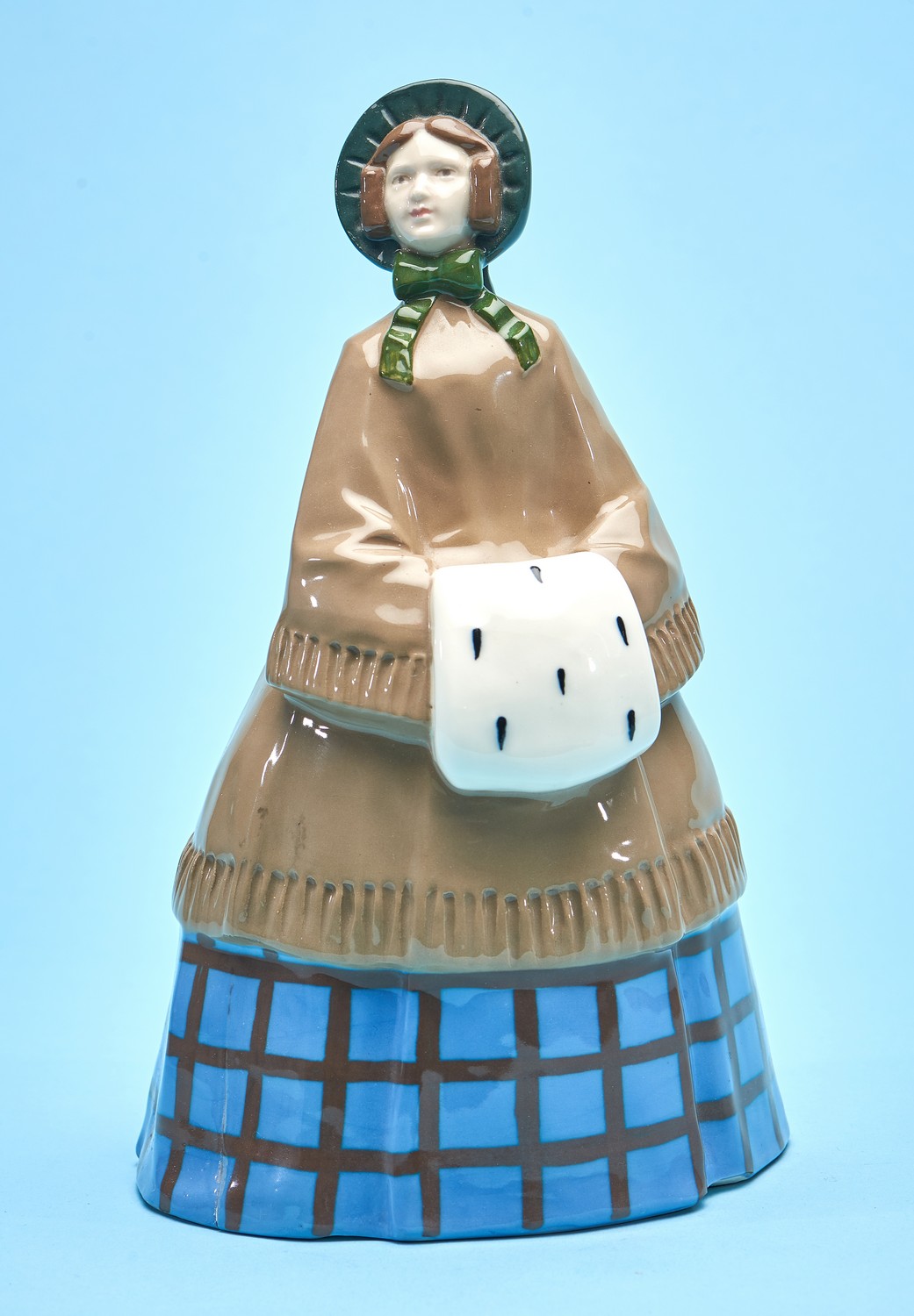 Depciting a female dressed in a cloak and bonnet, holding a fur muff. Factory mark to underside of base.