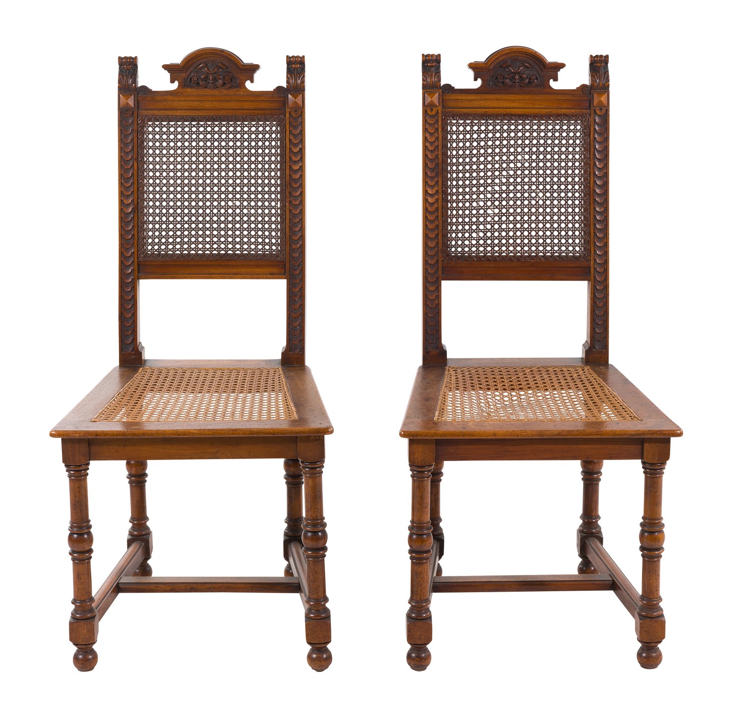 Each with a pediment featuring a relief carved allegorical face of North wind, flanked by square carved stiles with scrolled terminals, the rattan back and seat raised on turned legs united by stretchers