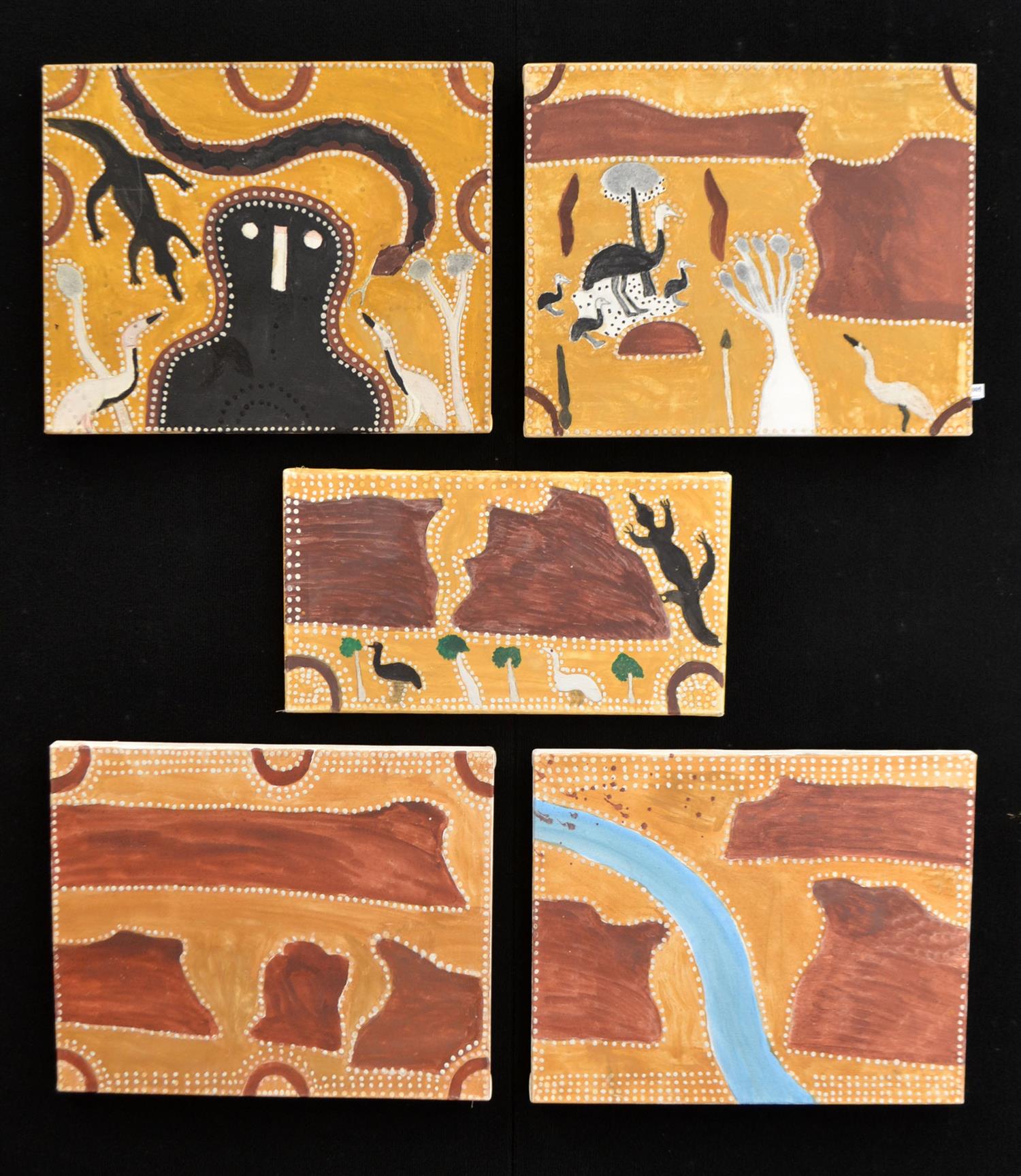 Surface blemishes and paint imperfections are present throughout all works. Dust settlement and small flecks of unintended paint (natural pigments) seen randomly on the works. All five works are free from tears in the canvas, warping and moisture damage.