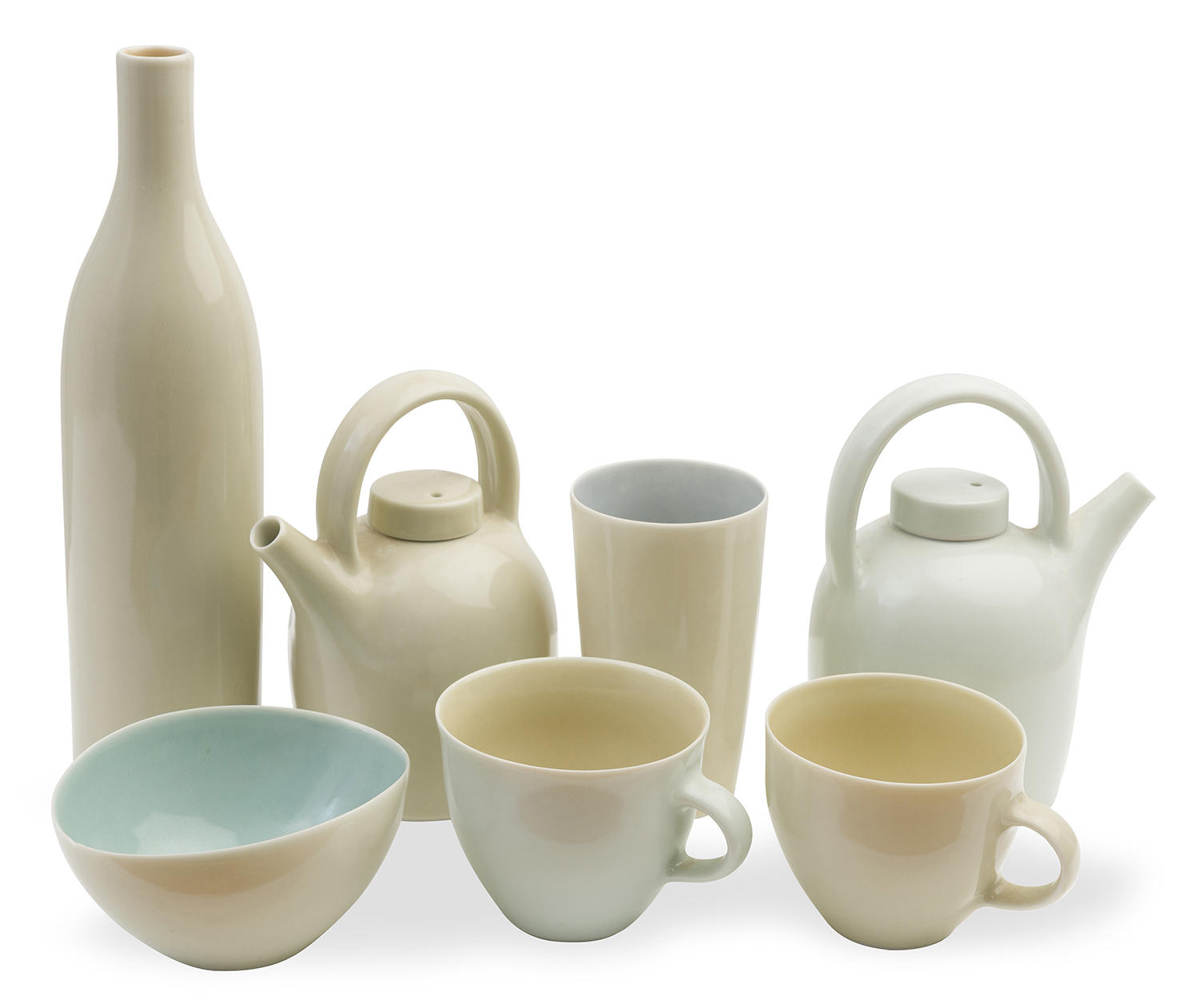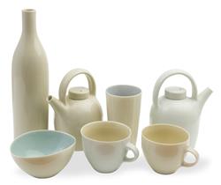 30cm (vase), 16cm (teapots, 2), 7cm (teacups, 2), 12cm (beaker), 5cm (bowl)