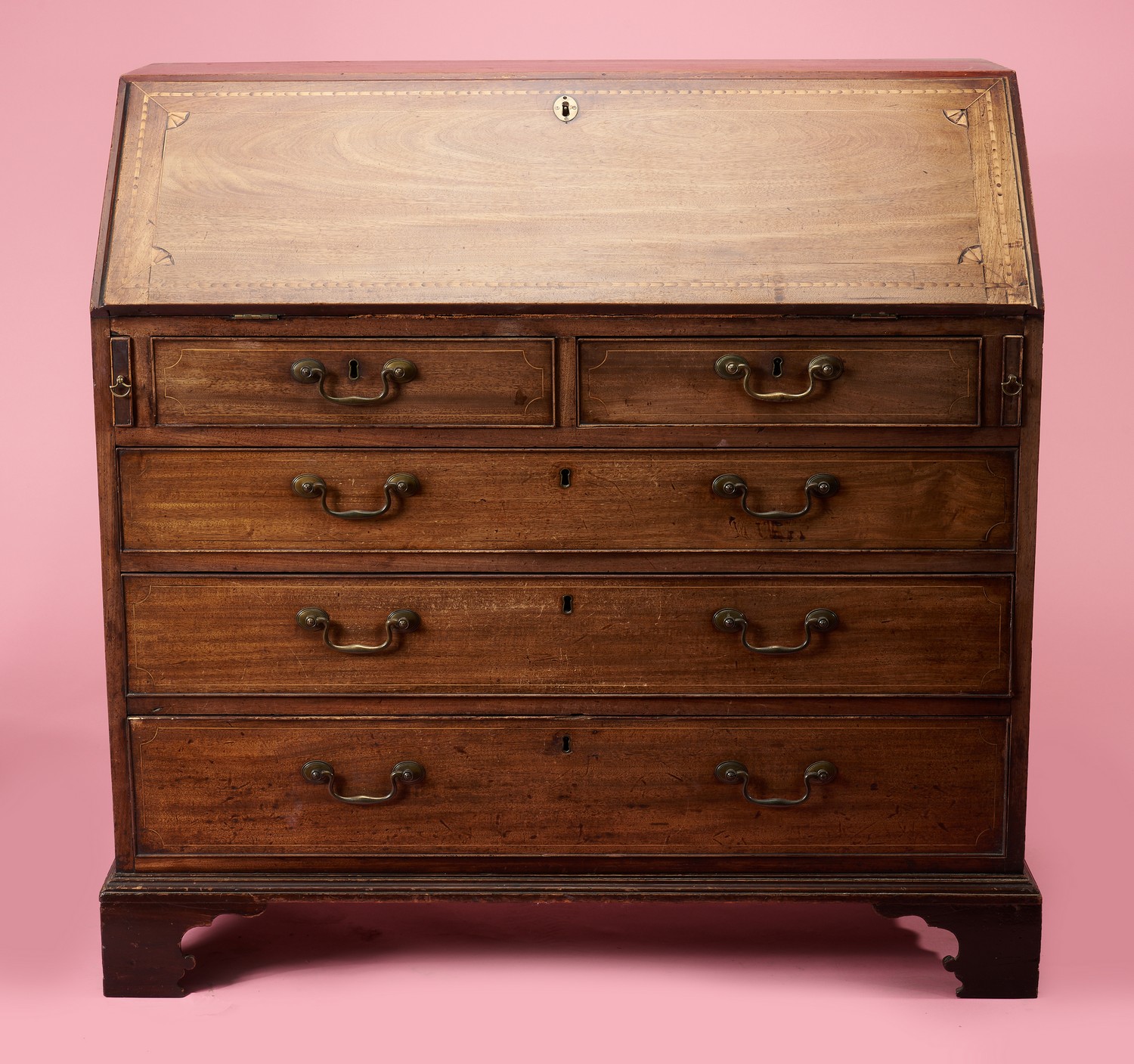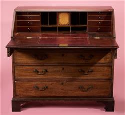 Of typical form, the drop-down leather inset bureau enclosing a fitted interior, above four graduating drawers, string inlay throughout, raised on bracket feet