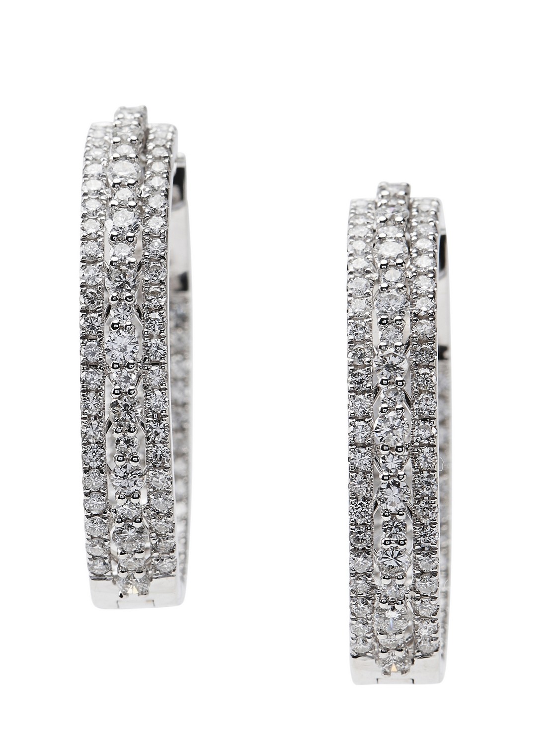 A PAIR OF DIAMOND EARRINGS - Of hoop design, the earrings pavé set with round brilliant cut totalling approximately 3.20cts, in 18ct...