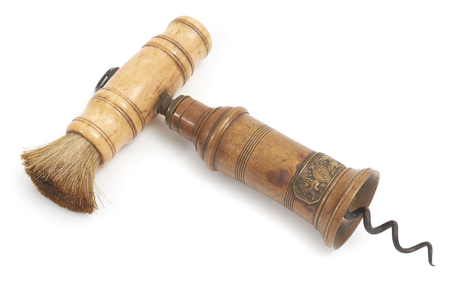 With turned bone handle and brush, with double action corkscrew. The brass cylinder with applied brass patent plaque