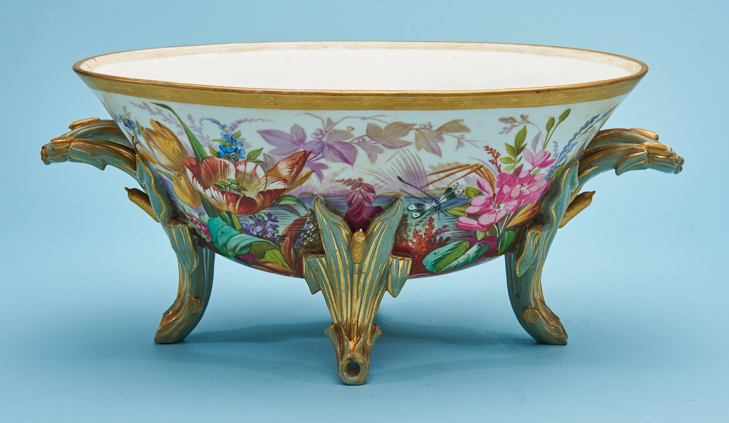 The tapering oval bowl, rasied on four naturalistic bullrush flower-form feet with matching handles. The whole nicely painted with floriate motifs.