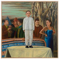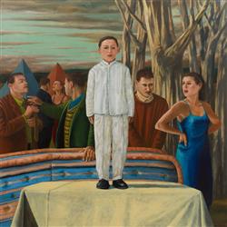 "Preparation of the Page" painting is based on a deep memory of the experience, of being on display in a role he didn't really understand. He remembers adults all dressed up and involved in their own activities that didn't involve him - Gavin Fry -